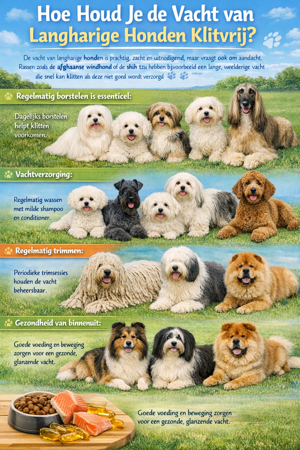 Ook de kniproutine speelt een belangrijke rol. Langharige rassen zoals de komondor, old english sheepdog en chow chow hebben baat bij periodieke trimsessies om klitten te voorkomen en de vacht hanteerbaar te houden. Zelfs een regelmatig geknipte maltezer of havanezer kan het verschil maken tussen een zachte, glanzende vacht en een verwarde, onhandelbare bos haar.