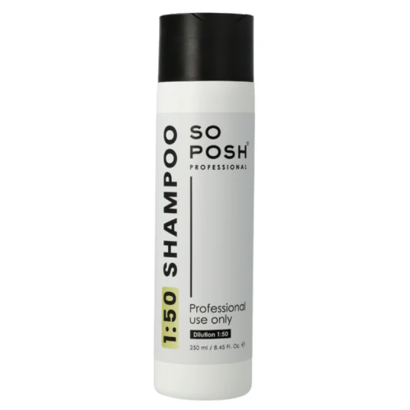 De So Posh 1:50 Shampoo is een hooggeconcentreerde, professionele shampoo die uitzonderlijk zuinig in gebruik is. Slechts een kleine hoeveelheid (verdunning tot 1:50) zorgt voor een rijke, zachte schuimreiniging die vuil en talg effectief verwijdert zonder de natuurlijke oliën van de huid aan te tasten.